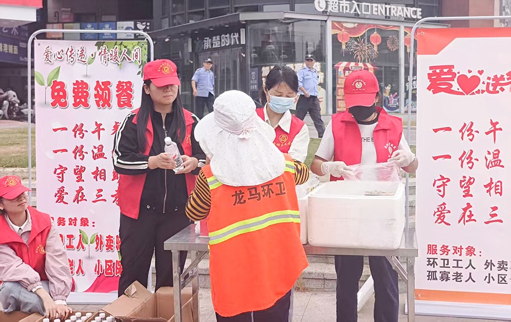 上午11点,一辆满载热乎饭菜的爱心餐车准时停靠,志愿者们迅速搭起分发点,将包装整齐的餐盒,逐一递到环卫工人、外卖骑手、孤寡老人和小区保洁及其他困难人群。